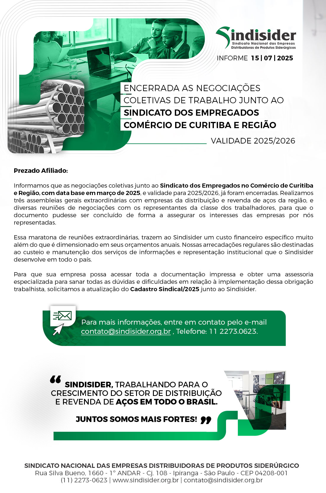 O SINDISIDER atua como sindicato patronal, em âmbito nacional, na defesa dos interesses da categoria econômica da qual fazem parte as empresas distribuidoras e revendedoras de produtos siderúrgicos, planos e longos, que atuam no Brasil.